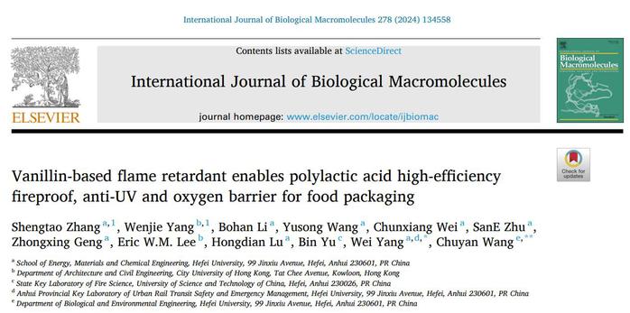 张圣涛在科研道路上敢于挑战自我,收获颇丰。截至目前,他发表SCI论文4篇,以第一和共同第一作者发表SCI论文2篇。其中以生物质阻燃剂为研究方向的论文《Vanillin-based flame retardant enables polylactic acid high-efficiency fireproof, anti-UV and oxygen barrier for food packaging》发表在国际期刊《International Journal of Biological Macromolecules》(IF=7.7)上,该研究以生物基原料香草醛采用简单的一步法合成一种生物基添加剂,用来在增强聚乳酸的整体性能,拓展了聚乳酸在多个领域的应用。